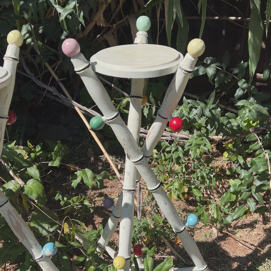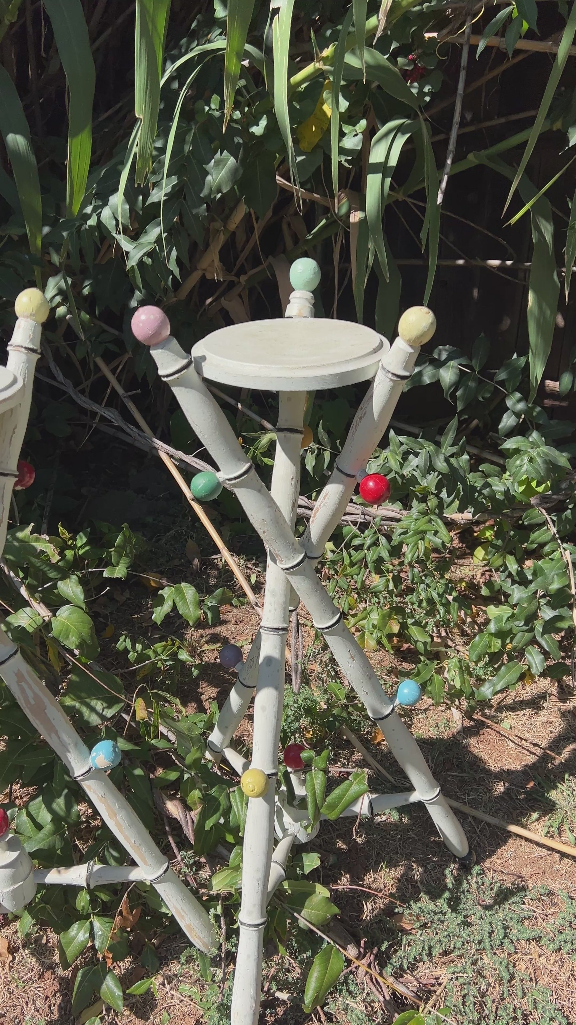 Crafted from solid wood, each table stands gracefully on three turned legs, intersecting in a sculptural, tripod formation. The original distressed white finish lends a timeworn charm, while colorful **polychrome spheres—painted in sherbet hues of lavender, coral, pistachio, and sky blue dot the structure like jewels. These whimsical orbs create a delightful visual rhythm, transforming utilitarian furniture into art.