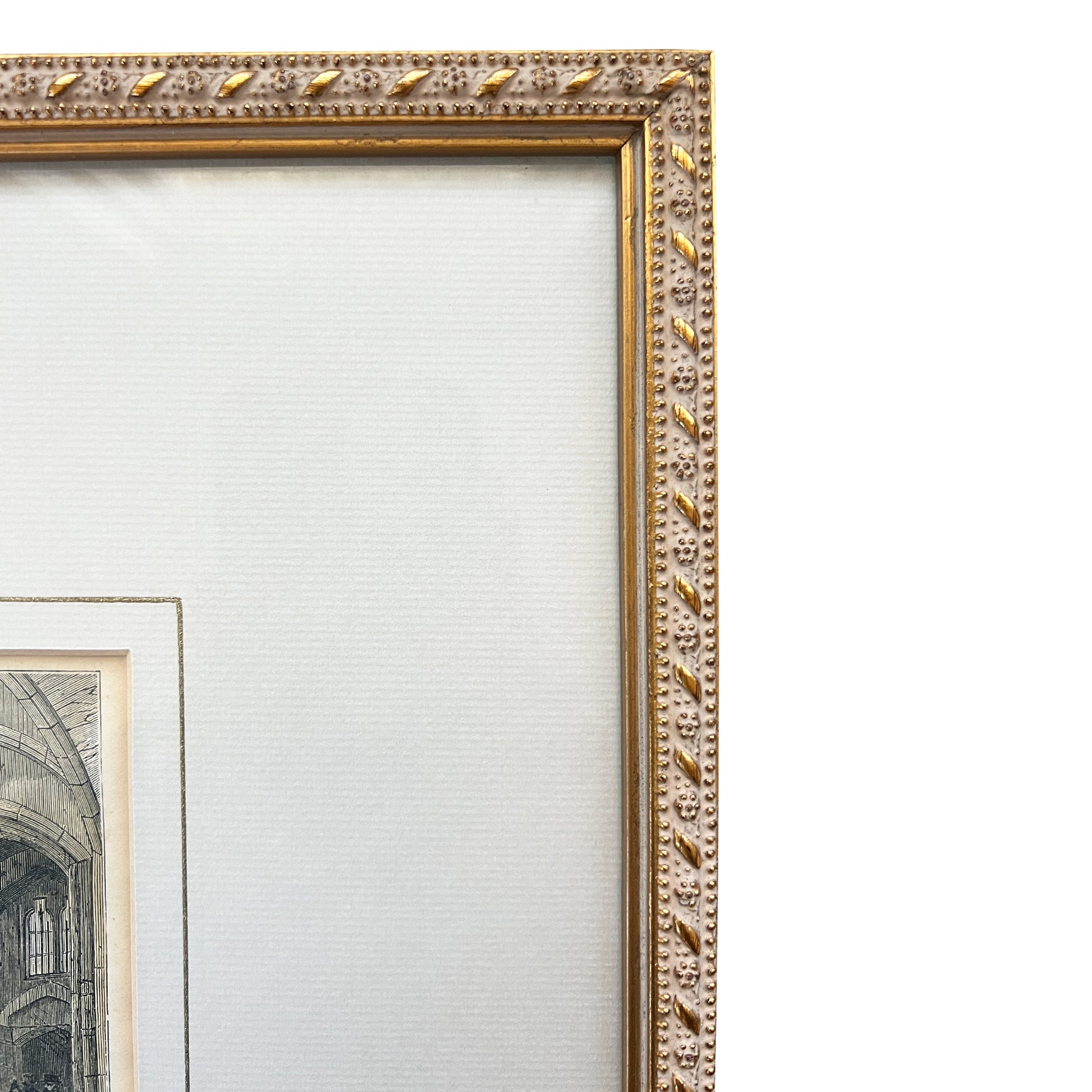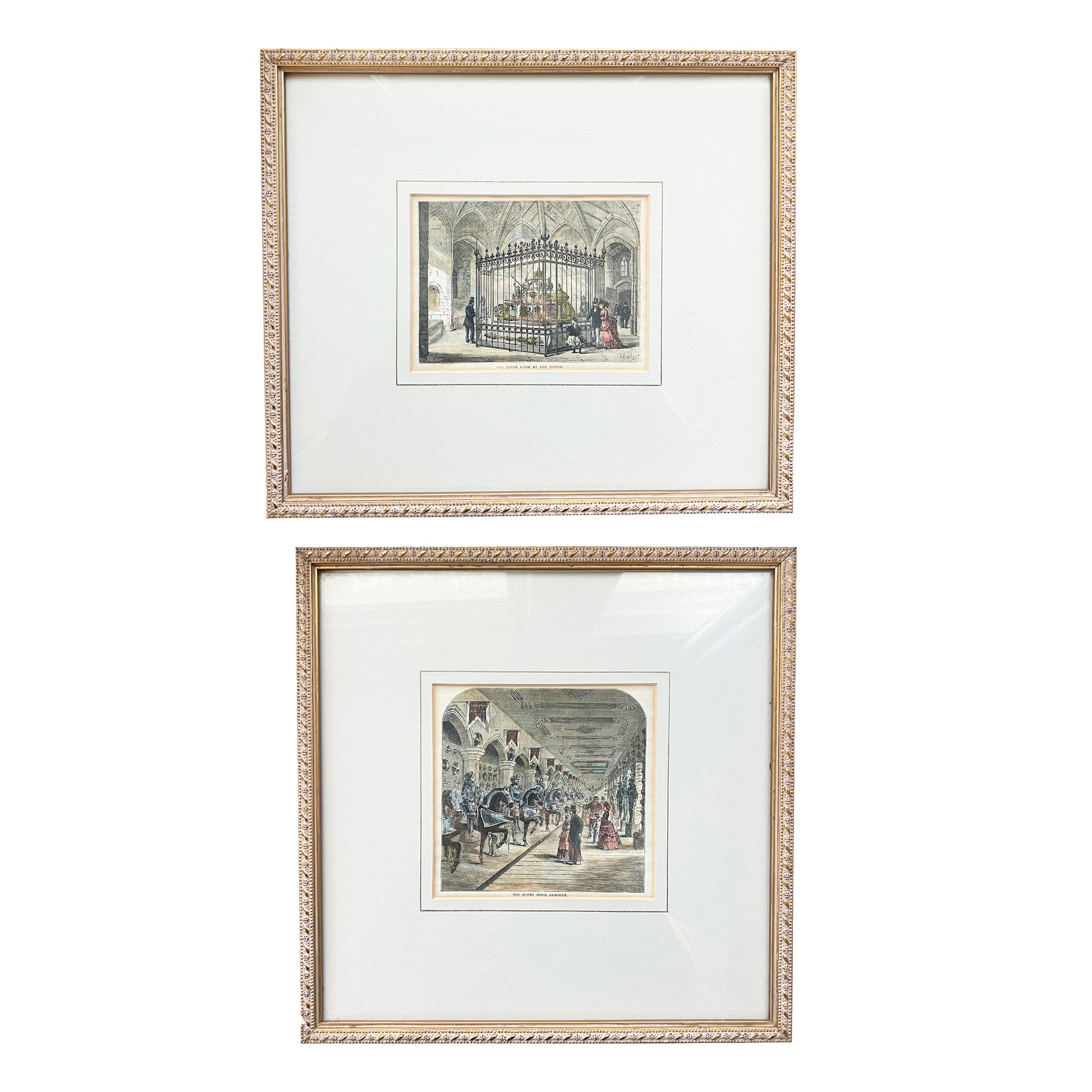 A striking pair of original Victorian hand-colored engraved transfer lithograph prints, depicting two iconic interiors within the Tower of London: The Tower Horse Armoury and The Jewel Room at the Tower. Both works are presented behind glass and housed in elegant antique giltwood frames with finely detailed beaded and foliate molding, creating a refined old-world collector’s presentation suitable for high-end interiors and design collections.