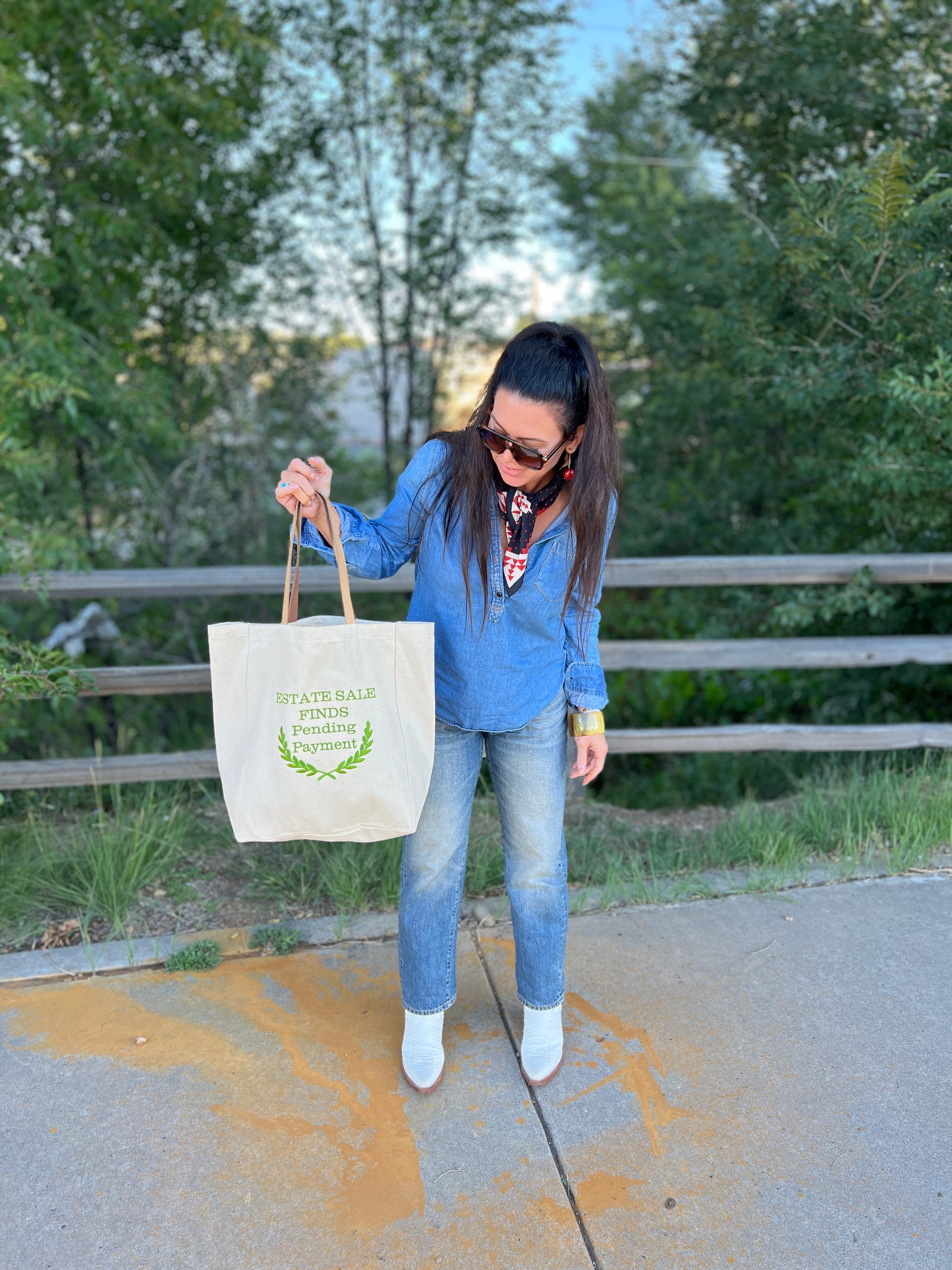 If you are anything like me at an estate sale, it gives me anxiety stuffing my finds in my unmarked canvas totes or left over shopping bags. I want the estate sale workers to know that I’ve just run out of hands and am using my handy dandy estate sale bag and that I’m heading to the cashier (or hold table).