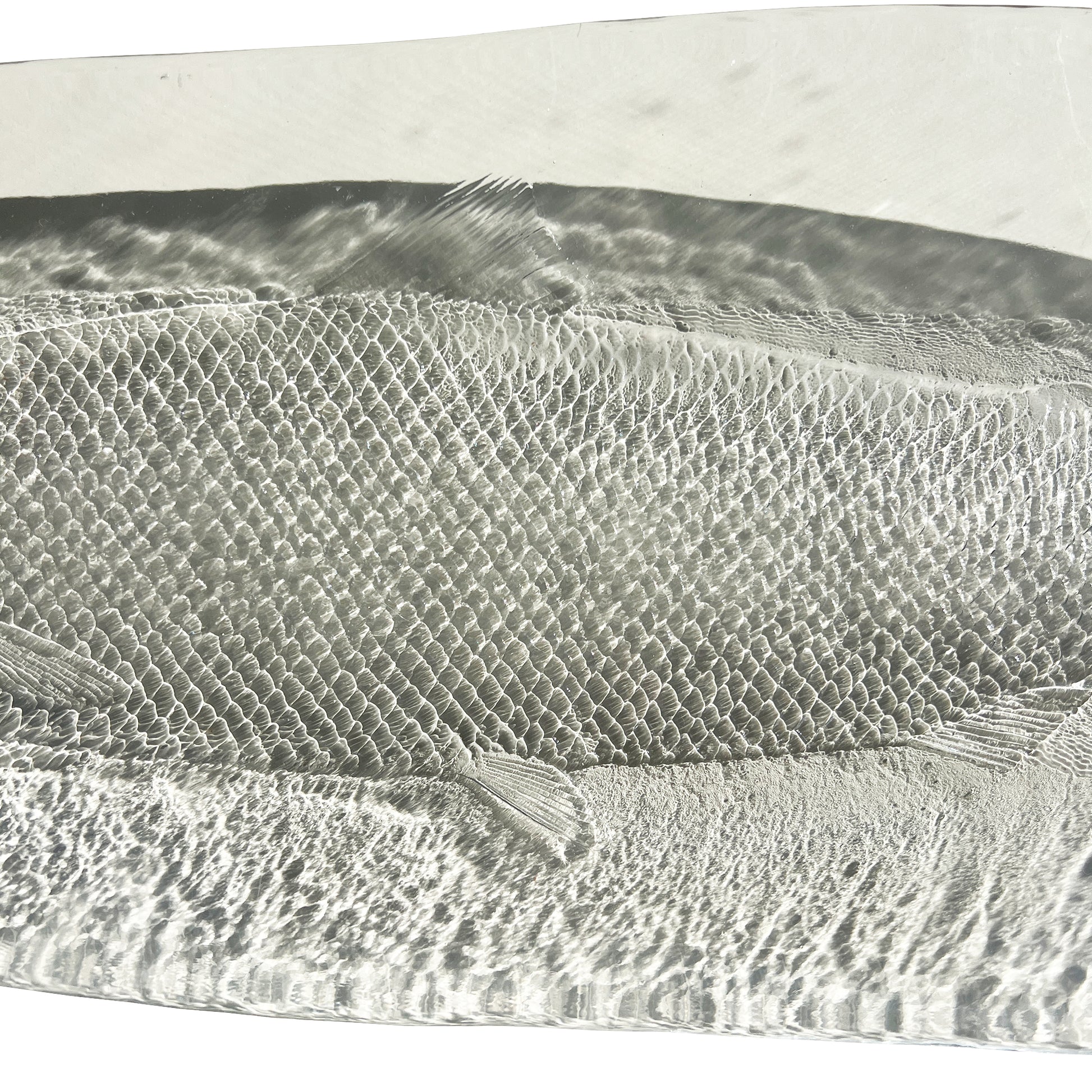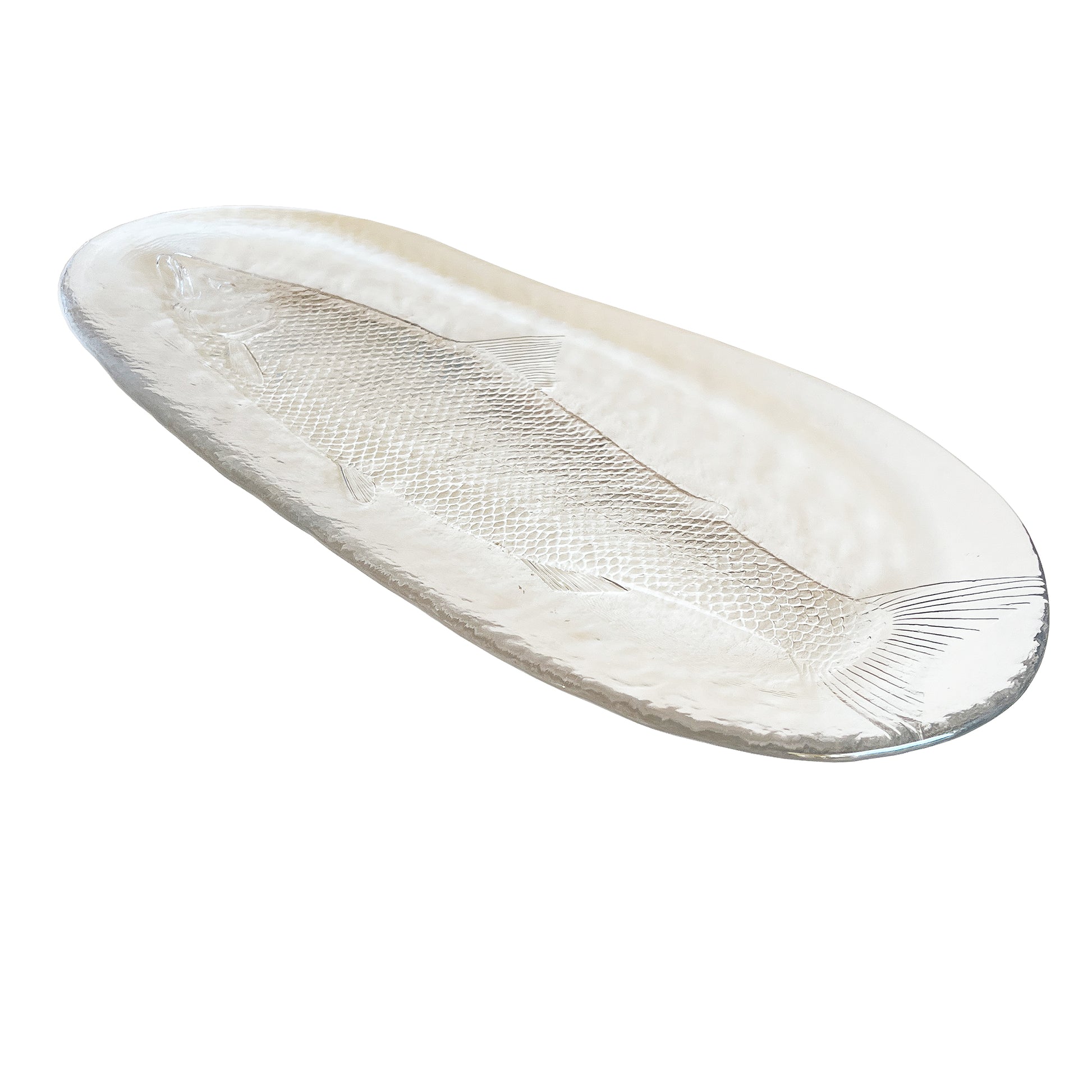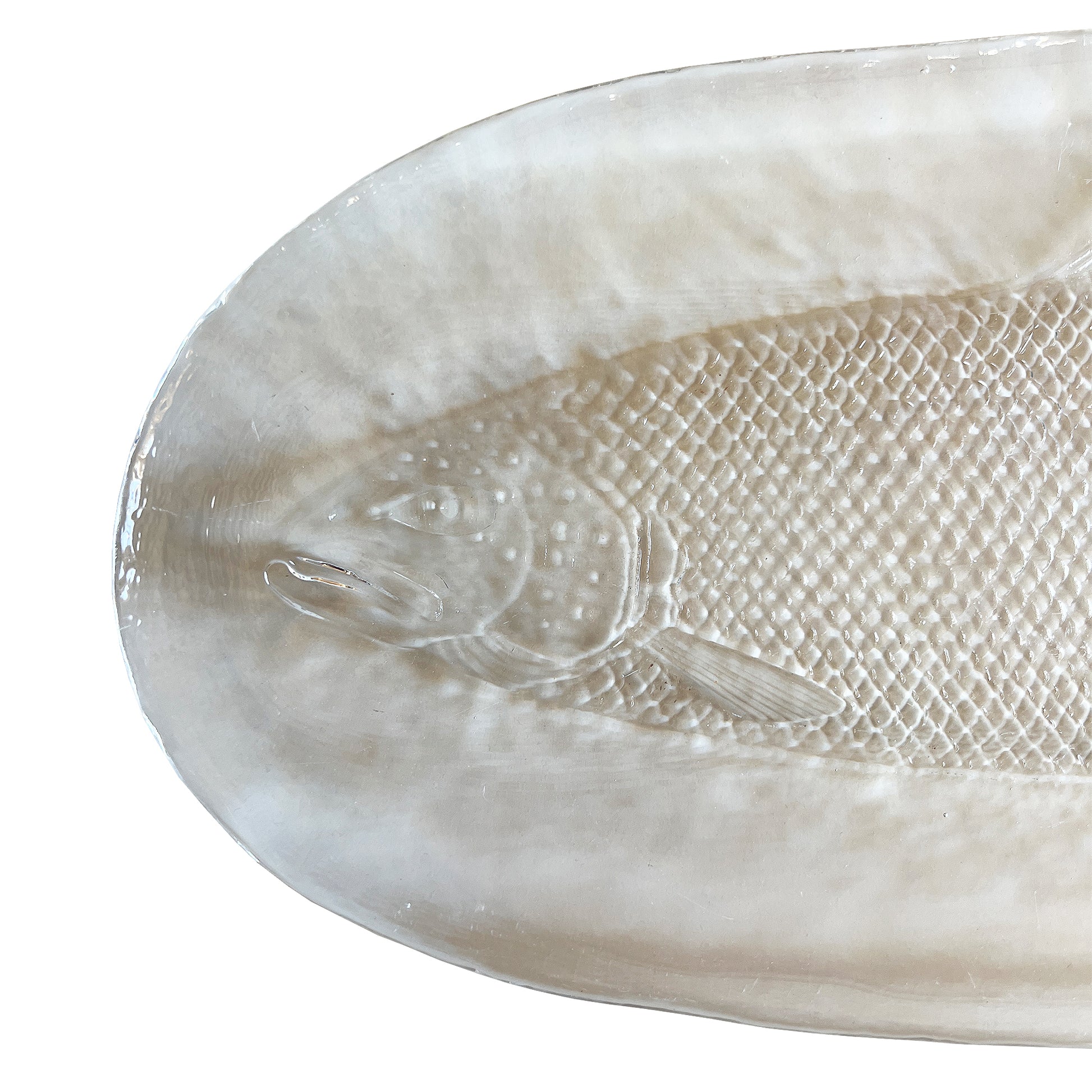 This striking French art glass platter features a finely modeled fish rendered in high-relief beneath a thick, softly contoured glass surface. The platter is substantial in weight and presence, with a beautifully elongated oval form and exceptional textural detail—from the finely articulated scales to the delicately rendered fins and head.