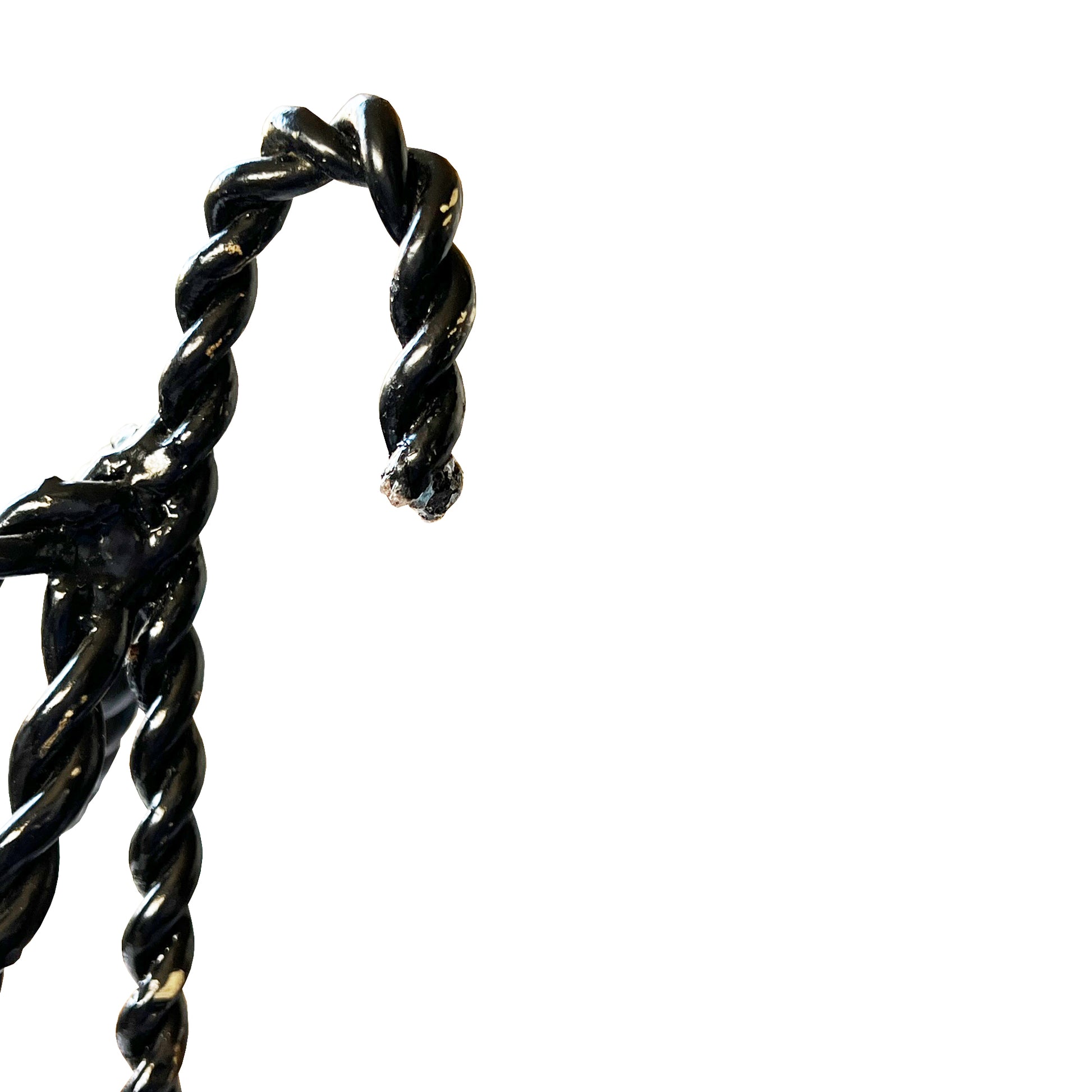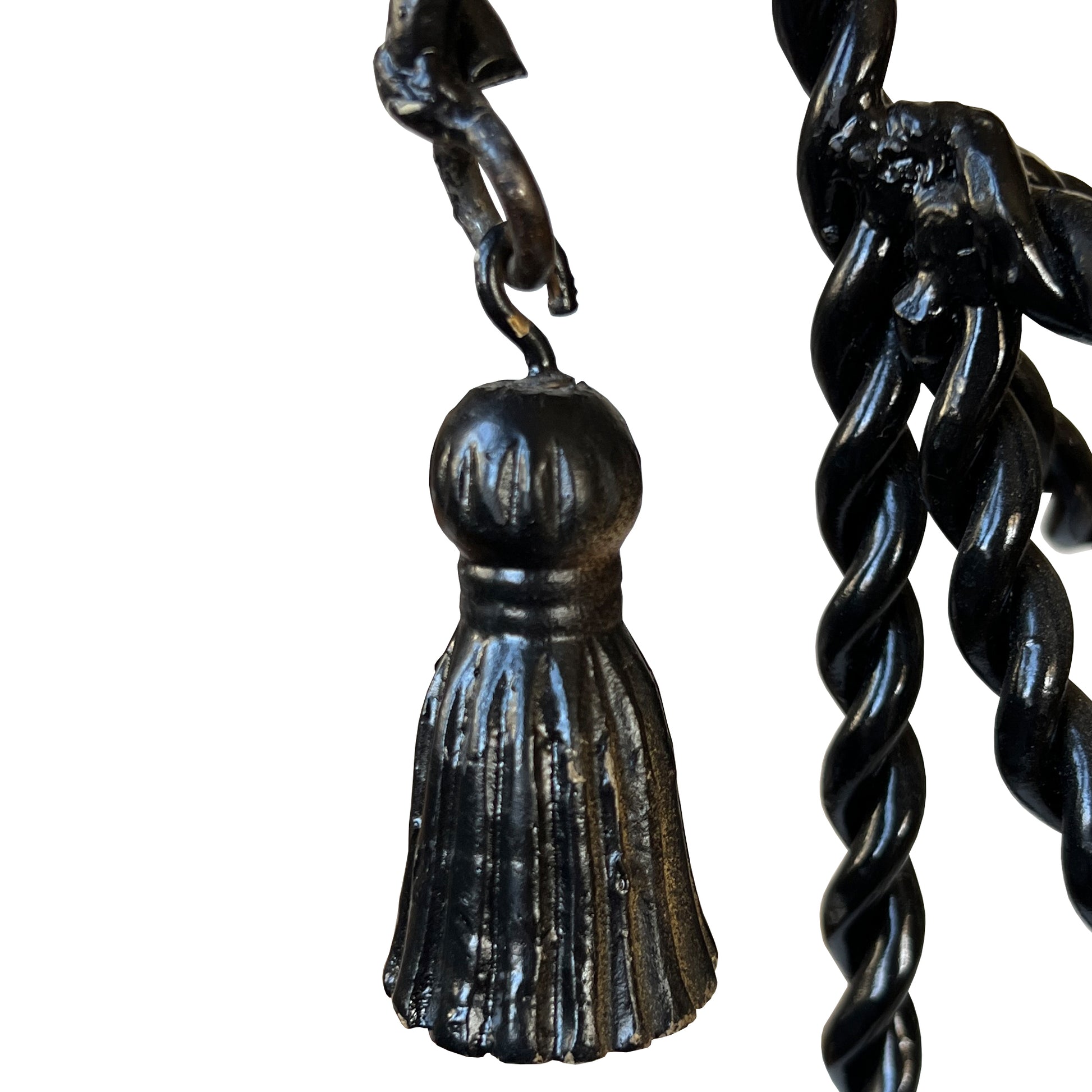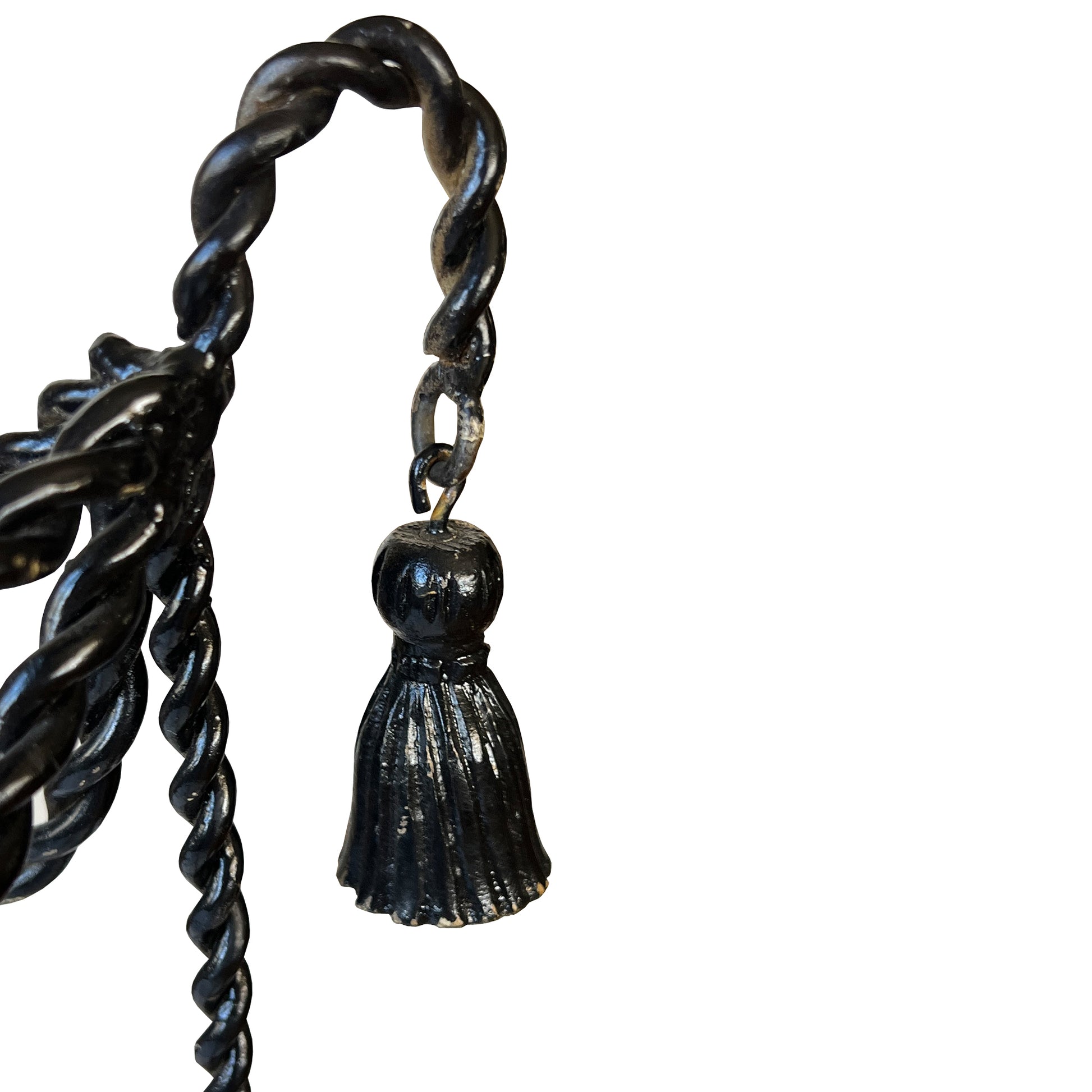 This vintage magazine rack, designed in the sought-after Hollywood Regency style, features elegant twisted wrought-iron construction, draped rope-like detailing, and three refined tassel finials that instantly elevate its silhouette. Collectors searching for decorative iron magazine holders, tassel décor, or mid-century black iron accents will immediately recognize the charm and craftsmanship of this piece.