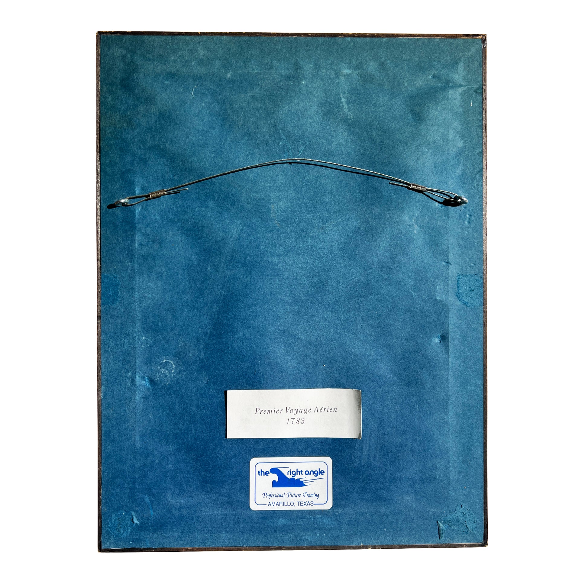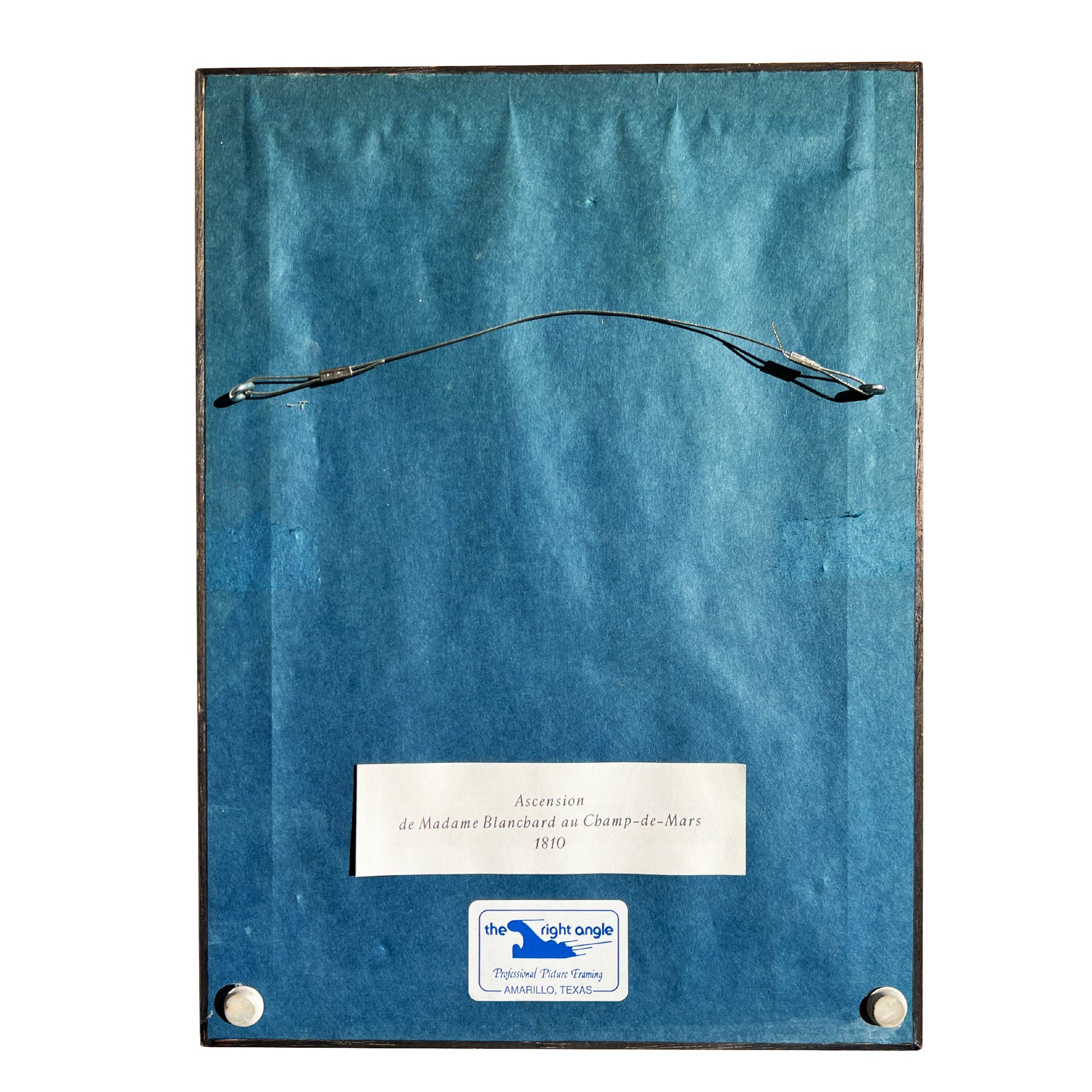 Excellent vintage condition. Minor age toning consistent with vintage paper. Frames and glass are in beautiful shape with light wear appropriate to age. Each back is marked with a sticker. One which says 'Ascension de Madame Blanchard au Champs-de-Mars 1810' and the second, 'Premier Voyage Aérien 1783'. Both were framed at The Right Angle in Amarillo, Texas, according to separate stickers on the backs. These pieces have not been examined outside of the frames. It is likely that these are German reprints created in the mid-20th century. However, there is no way to know unless we dismantle the frames. Both frames have a hanging wire attached for easy installation.