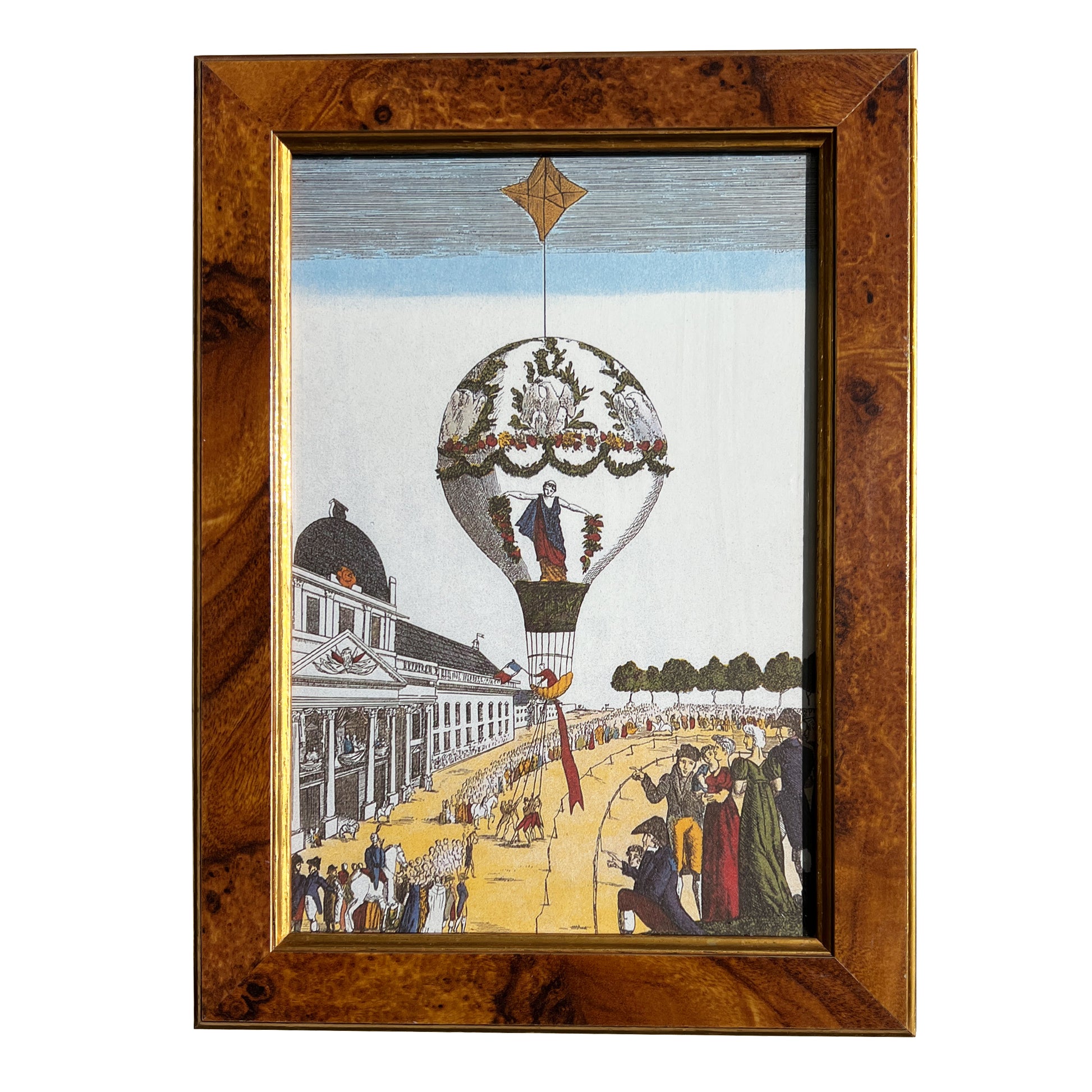 Sourced in Santa Fe, New Mexico, from a collector of fine European prints and travel-inspired art. Likely mid-20th-century reproductions after 18th-century engravings, carefully hand-colored and presented in custom burl veneer frames. Several lithographs of the balloons from a book that was made about early air balloon flight are included in Andrei Tarkovsky's classic movie 'Solaris', including these.
