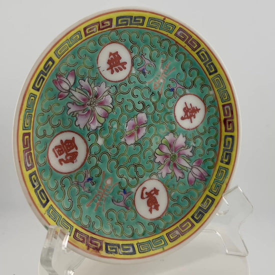 Chinese Export Famille Rose Teacup & Three Saucer Plates, Longevity Motif