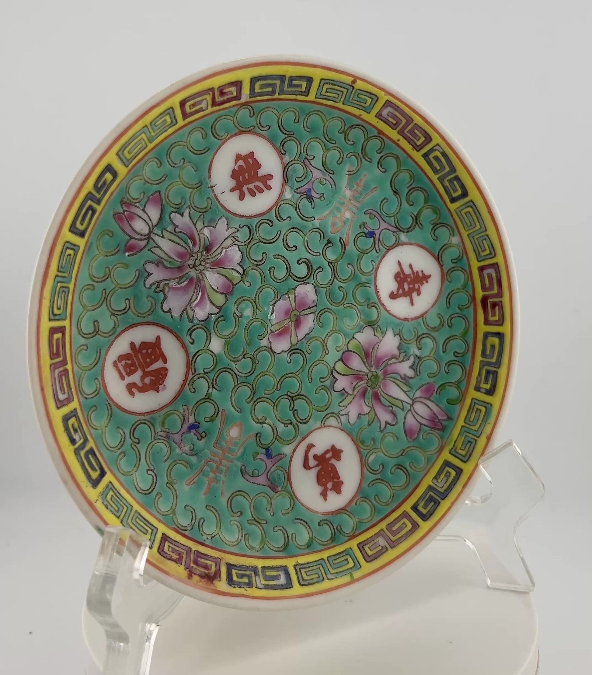 Each piece is intricately enameled with scrolling lotus arabesques, auspicious florals, and roundels enclosing iron-red longevity characters and symbolic emblems. The borders are finished with a key-fret (leiwen) band in alternating famille-rose enamels and gilt, a design traditionally associated with prosperity and continuity.
