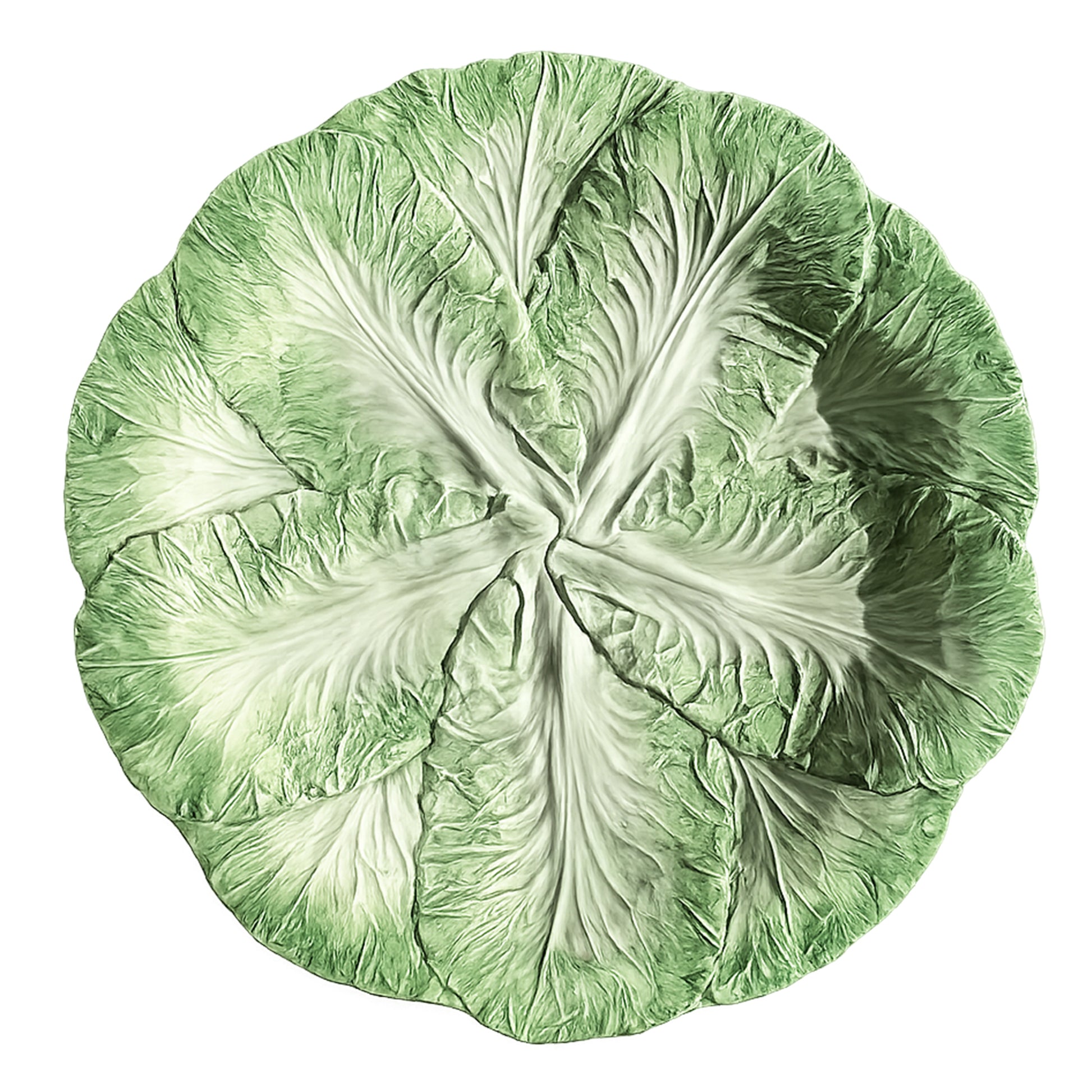The glazing is masterfully applied in tonal greens with creamy veining that mimics the natural structure of cabbage leaves, while the citrus top introduces a striking pop of saturated yellow. Both whimsical and grand in scale, this piece blurs the line between functional ceramic and statement table sculpture.