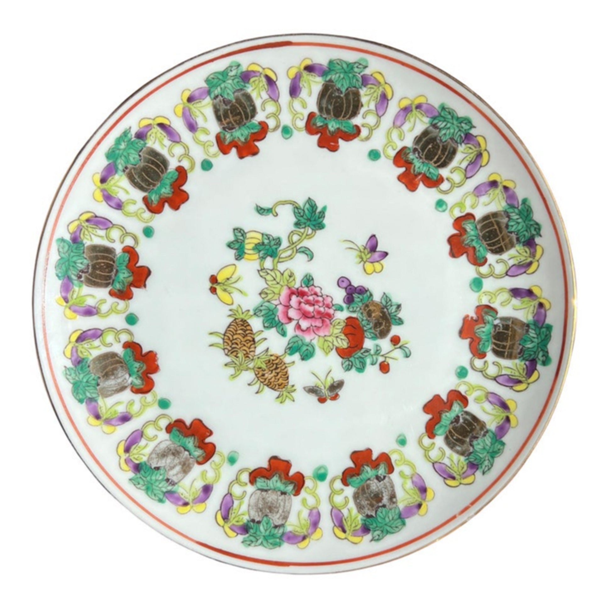 Antique Chinoiserie Famille Rose Porcelain Plate with Pineapple & Floral Motifs