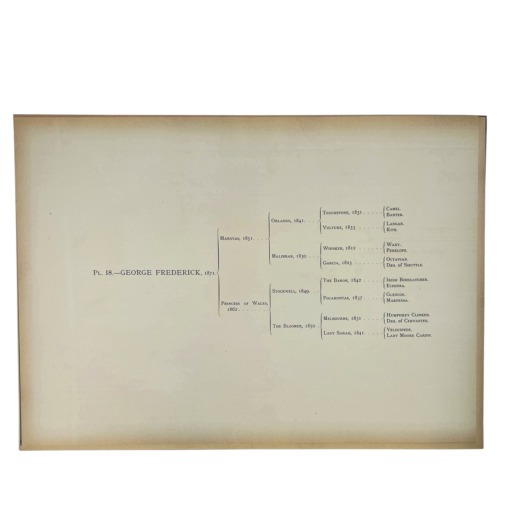 The verso features a detailed pedigree chart, tracing George Frederick’s lineage through distinguished racehorses including Marsyas (1851), Stockwell (1849), and Touchstone (1831)—a fascinating visual of 19th-century thoroughbred breeding history.