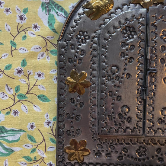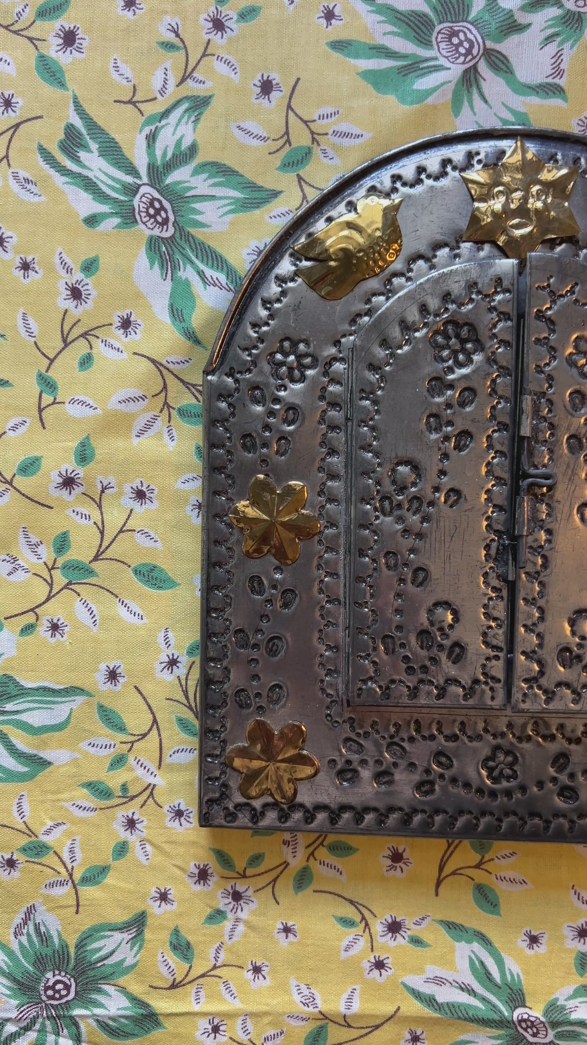 At its center, the scalloped mirror sits behind a pair of hinged opening doors, allowing the piece to be displayed either open to reveal the mirror or closed as a decorative wall shrine. The craftsmanship reflects classic San Miguel de Allende-style repoussé work, with each hammered design executed by hand using age-old metal-working techniques.