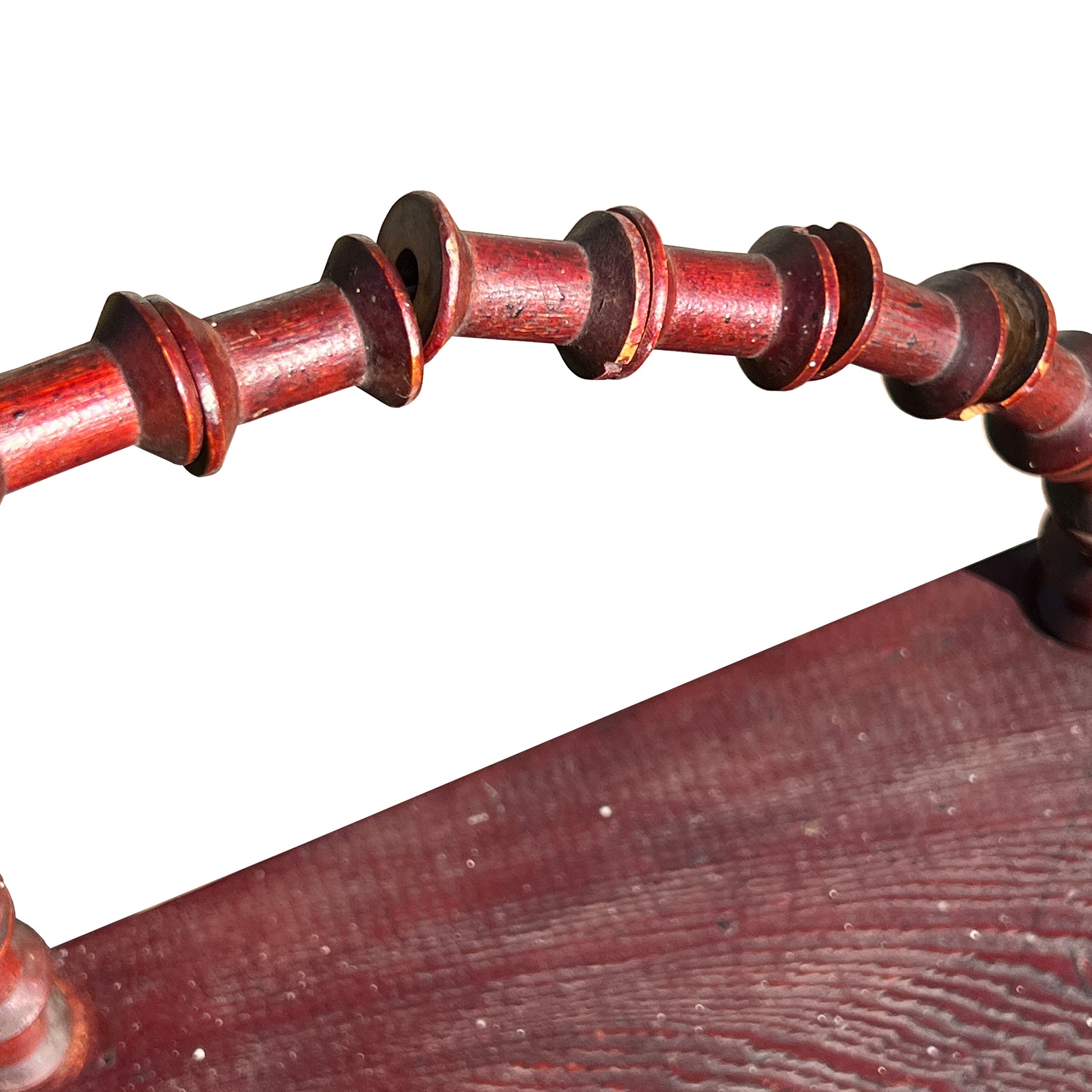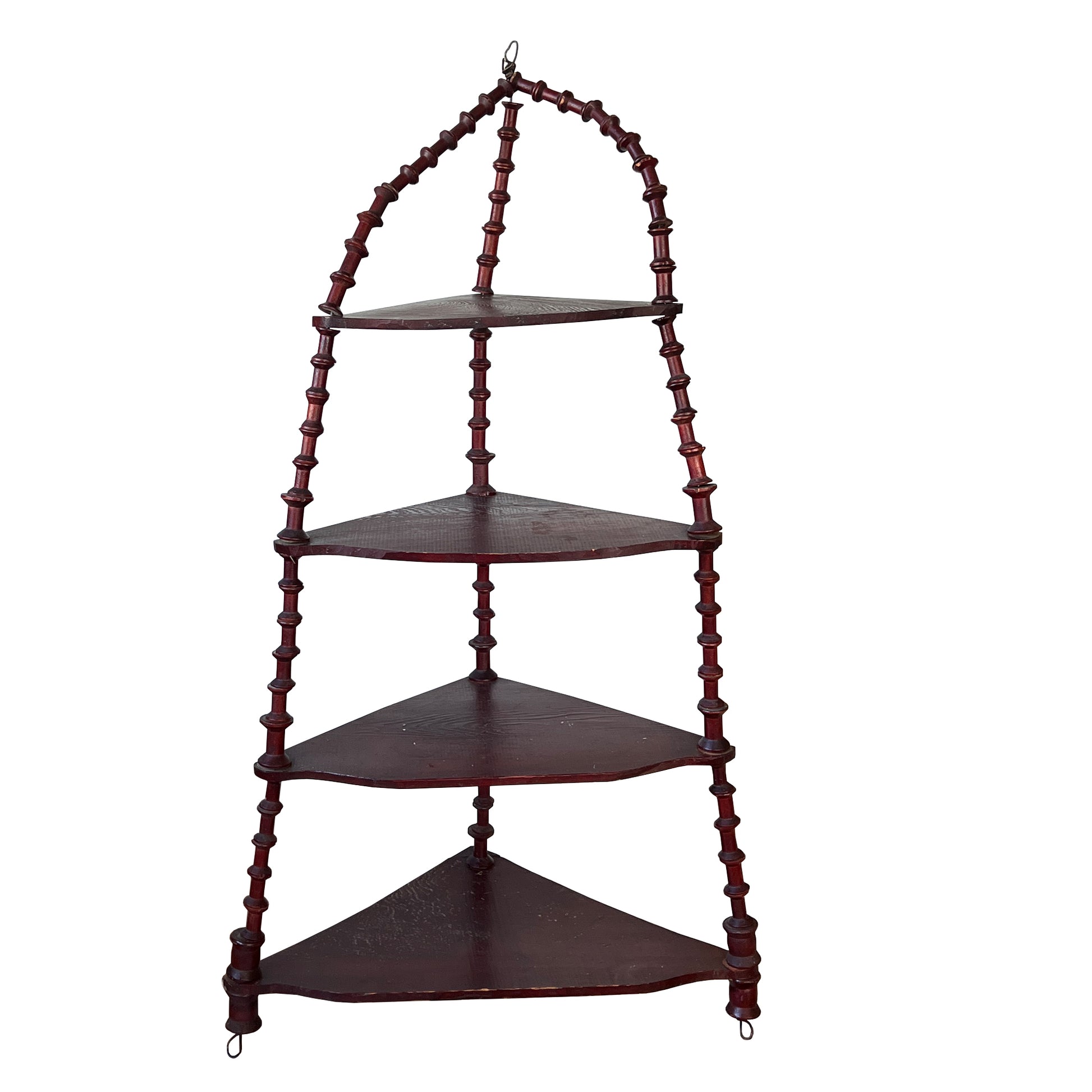 A beautiful antique hanging corner shelf or étagère, featuring finely spool-turned supports and five graduated triangular shelves in their original oxblood red painted finish. The craftsmanship and patina suggest a late 19th to early 20th-century American origin, with design roots in both Victorian spool furniture and Shaker-style simplicity.