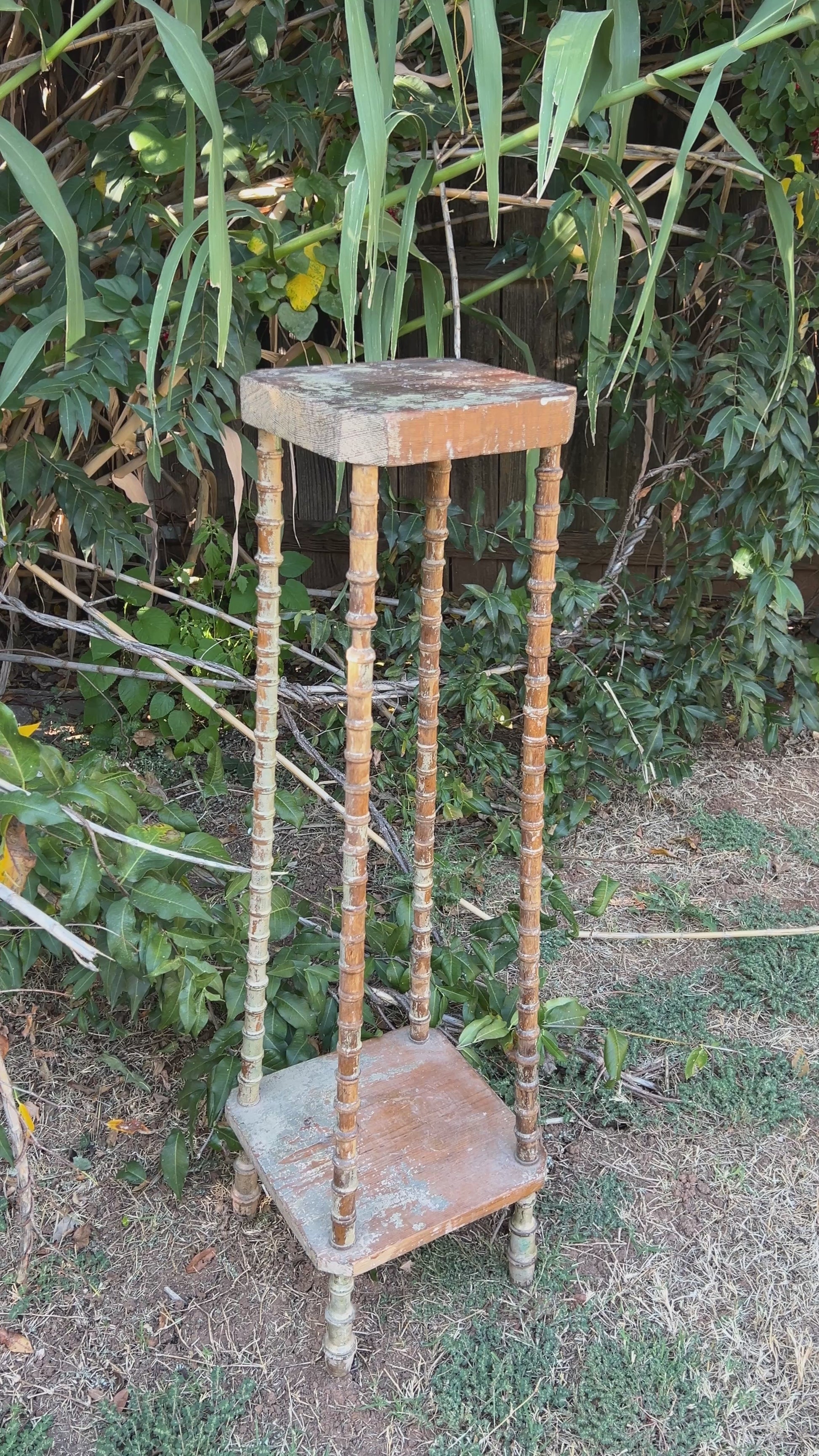 The table’s two-tier design offers both visual lightness and functional appeal—perfect for displaying a favorite vase, sculpture, or stack of art books. The top bears the rich patina of time, with surface wear and character marks that speak to generations of use and history. Each turned spindle leg tells its own story, a testament to handwork long before the age of machines.