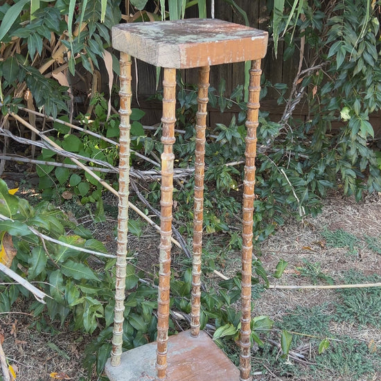 Step into the quiet beauty of the past with this rare, tall antique spool-leg accent table, discovered at the estate sale of noted Santa Fe collector Jonathan Parks. Crafted in the late 1800s, this elegant piece embodies the charm of the American Southwest’s rustic-meets-refined aesthetic. Its spool-turned legs, a hallmark of 19th-century craftsmanship, are delicately hand-carved and retain their original weathered finish, revealing layers of soft ochre, faded cream, and traces of old paint worn beautifully with age.