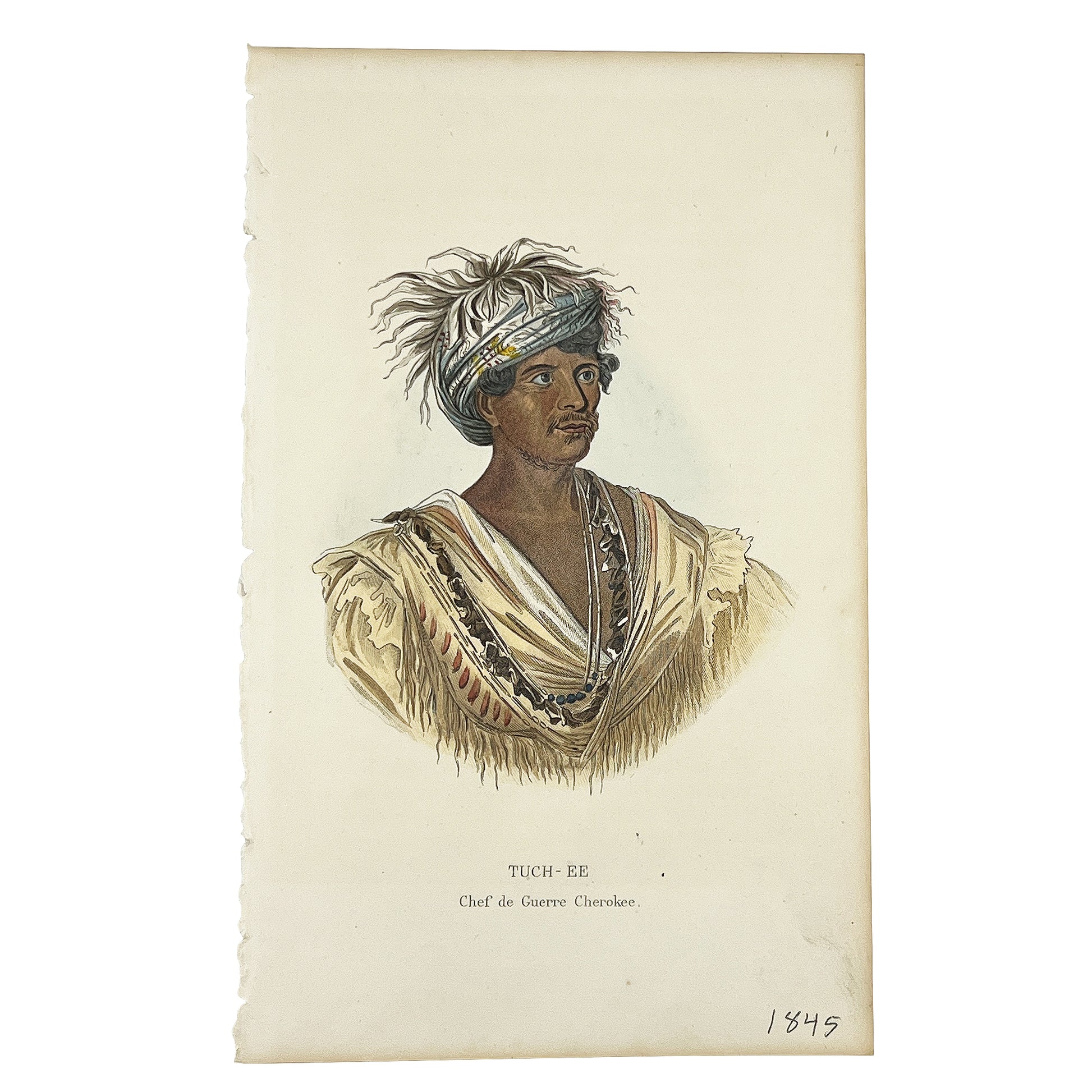 A striking mid-19th century hand-colored engraving depicting “Tuch-ee, Chef de Guerre Cherokee”, a Cherokee war chief, after the work of renowned American artist George Catlin.