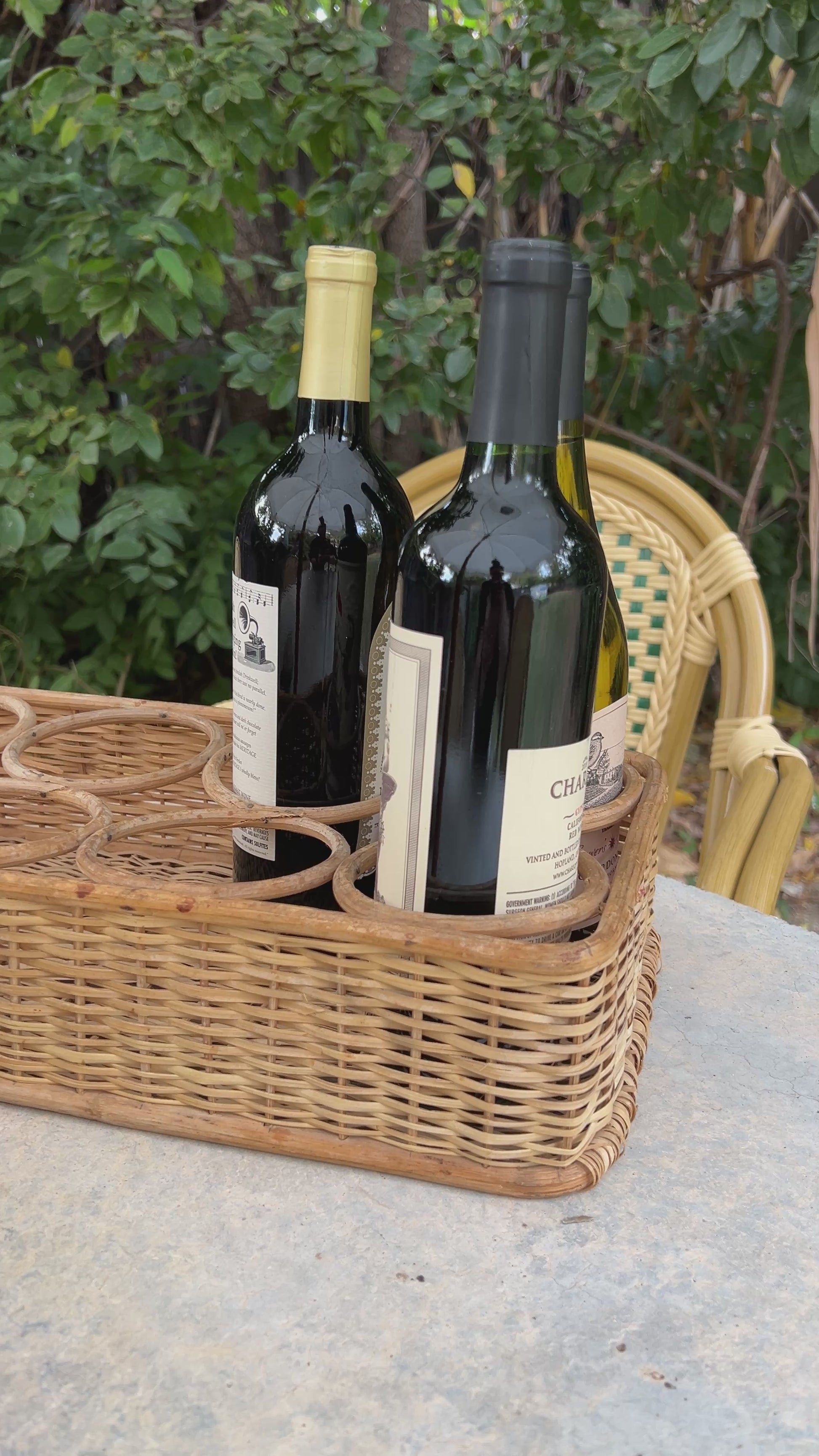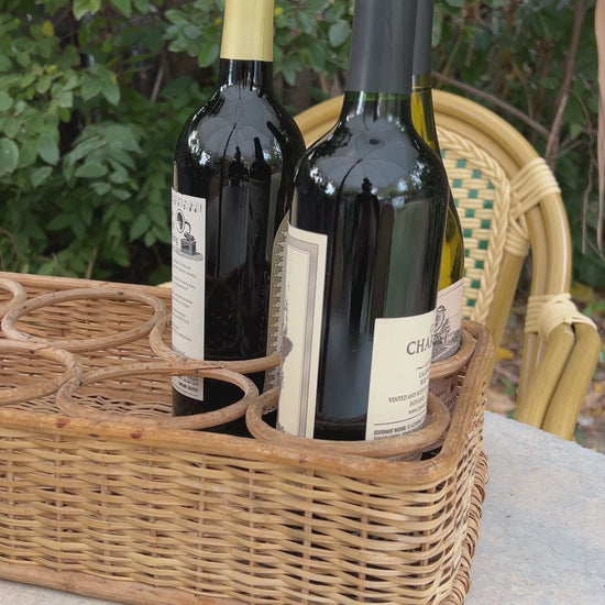 A charming handwoven wicker wine bottle rack, sourced in Santa Fe, New Mexico, and crafted from natural rattan in the mid-20th century. This basket-form rack features eight circular bottle compartments framed within a rectangular woven base — a perfect blend of function and organic design.